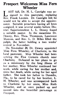 Miss Fern Wheeler welcomed to the pastorate at Freeport Methodist church