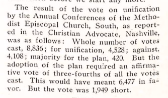 A vote for unification by the Annual Conferences of the Methodist Episcopal Church, South failed – 4,528 in favor, 4,108 against (3/4 majority required for approval.)